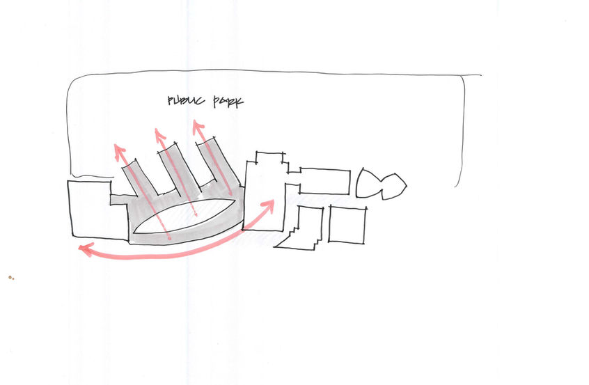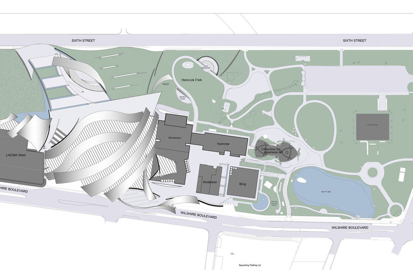 In the conceptual urban plan and architectural design for LACMA's new contemporary wing, the design challenged the conventional museum box through the introduction of a biomorphic, spiraling building that strives to connect LACMA east and west with dynamic forms that unite interior and exterior spaces of the existing buildings, parking, and landscape elements. A series of overlapping layers reveal art along a rising internal path that becomes an experiential art journey. Solid walls rise to envelope the art and guide the viewer, while the roof canopies float above, admitting changing patterns of northern light through a filtered Low-E glass in the ceiling. Collectively these elements synchronize into an interdependent conchal system; both structural and environmentally responsive. (Thesis, conceptual)